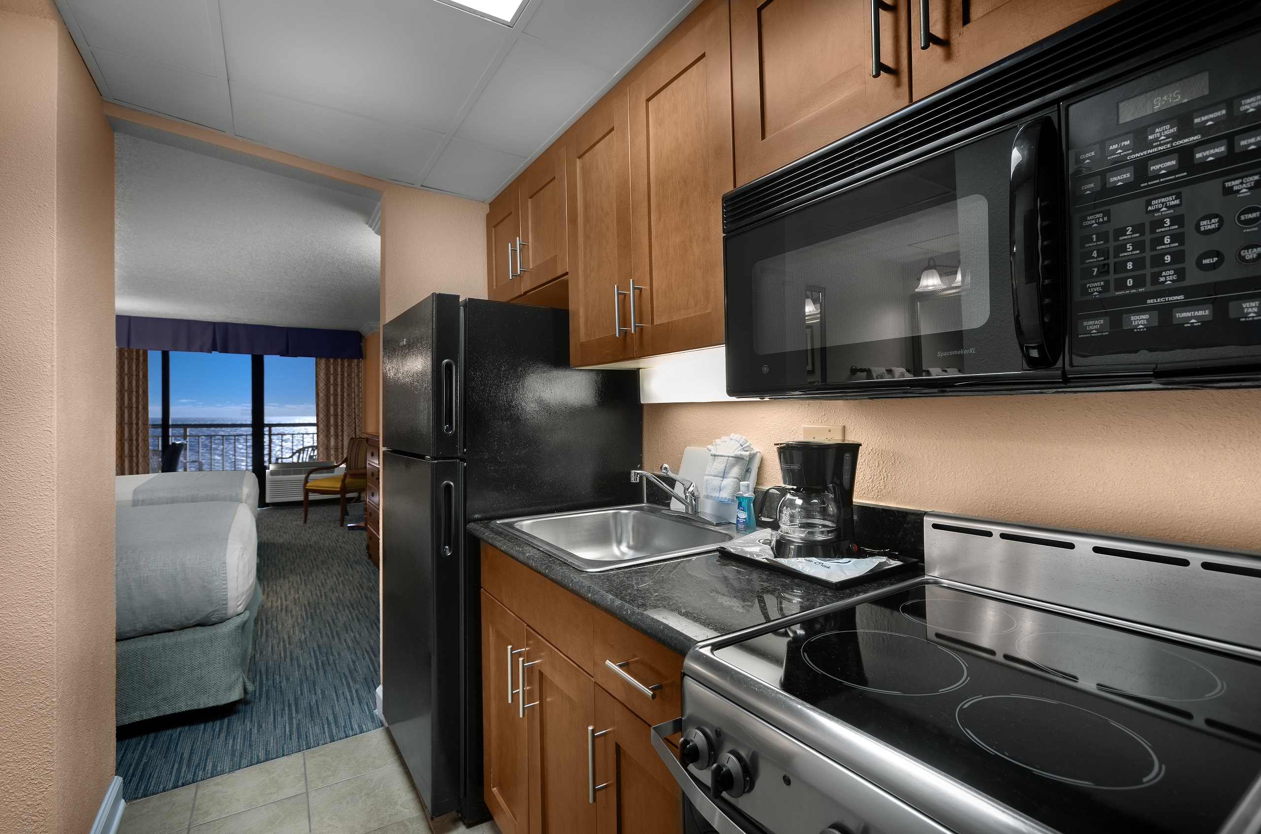 The Tower Oceanfront Efficiency kitchen includes basic pots, pans, dishes, utensils and glassware.